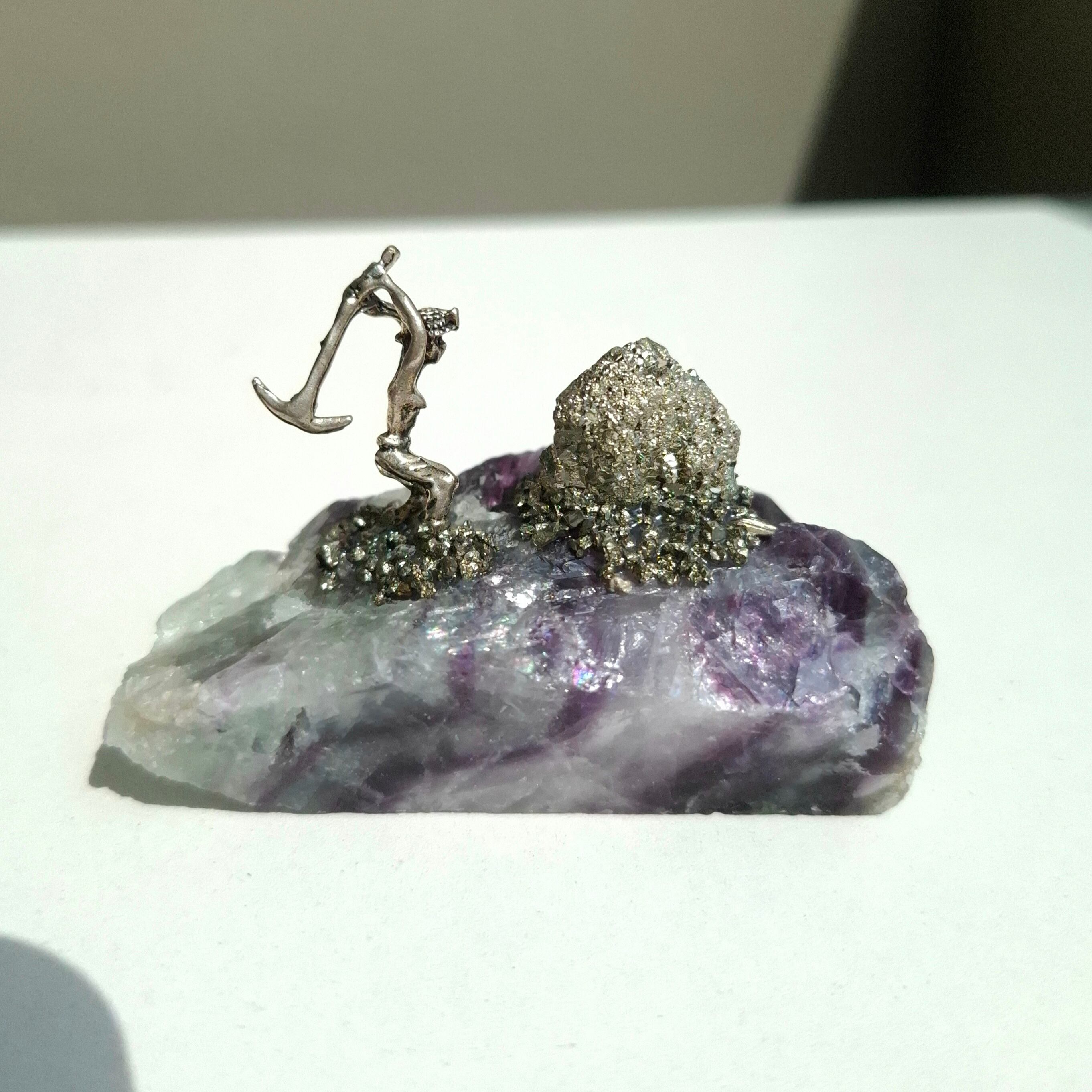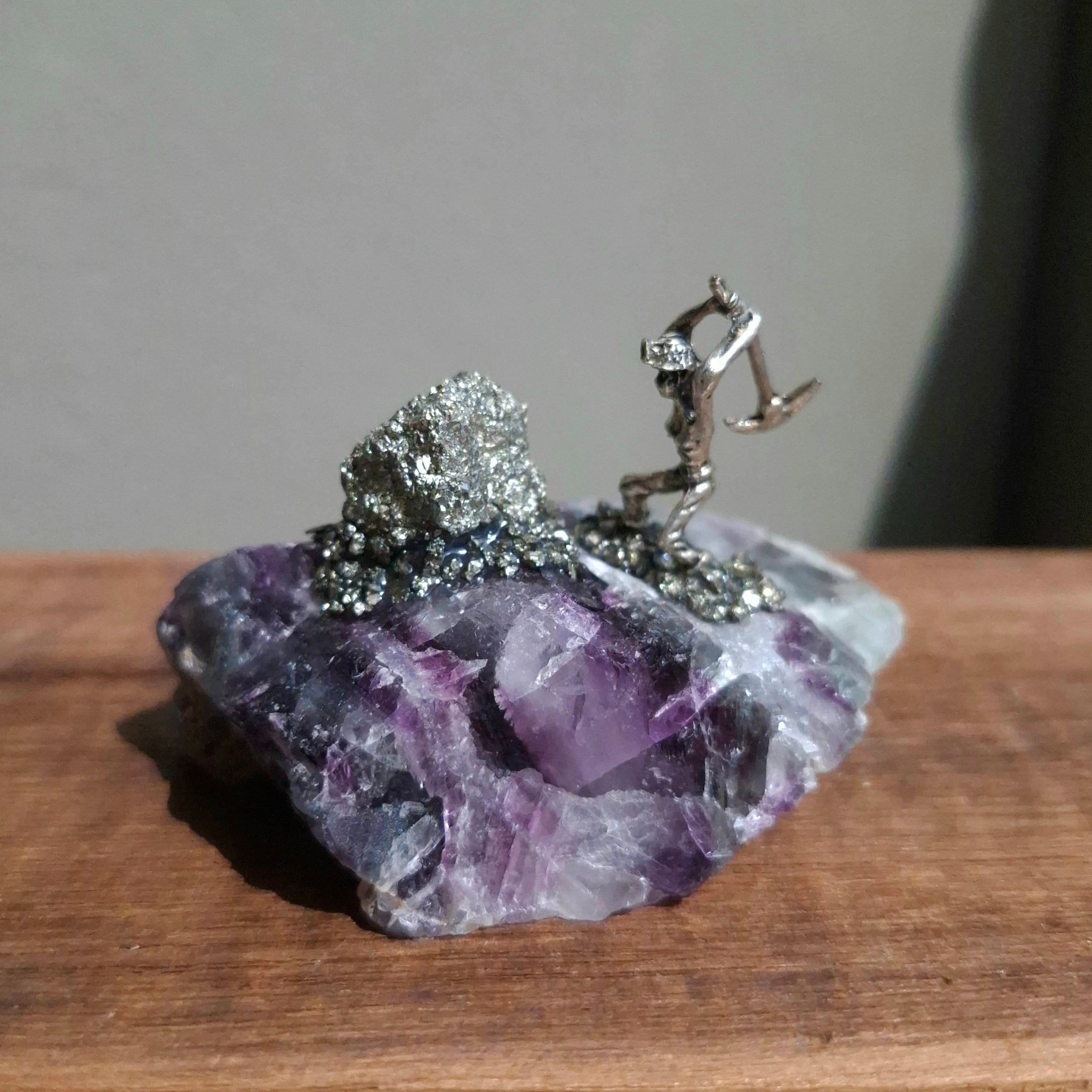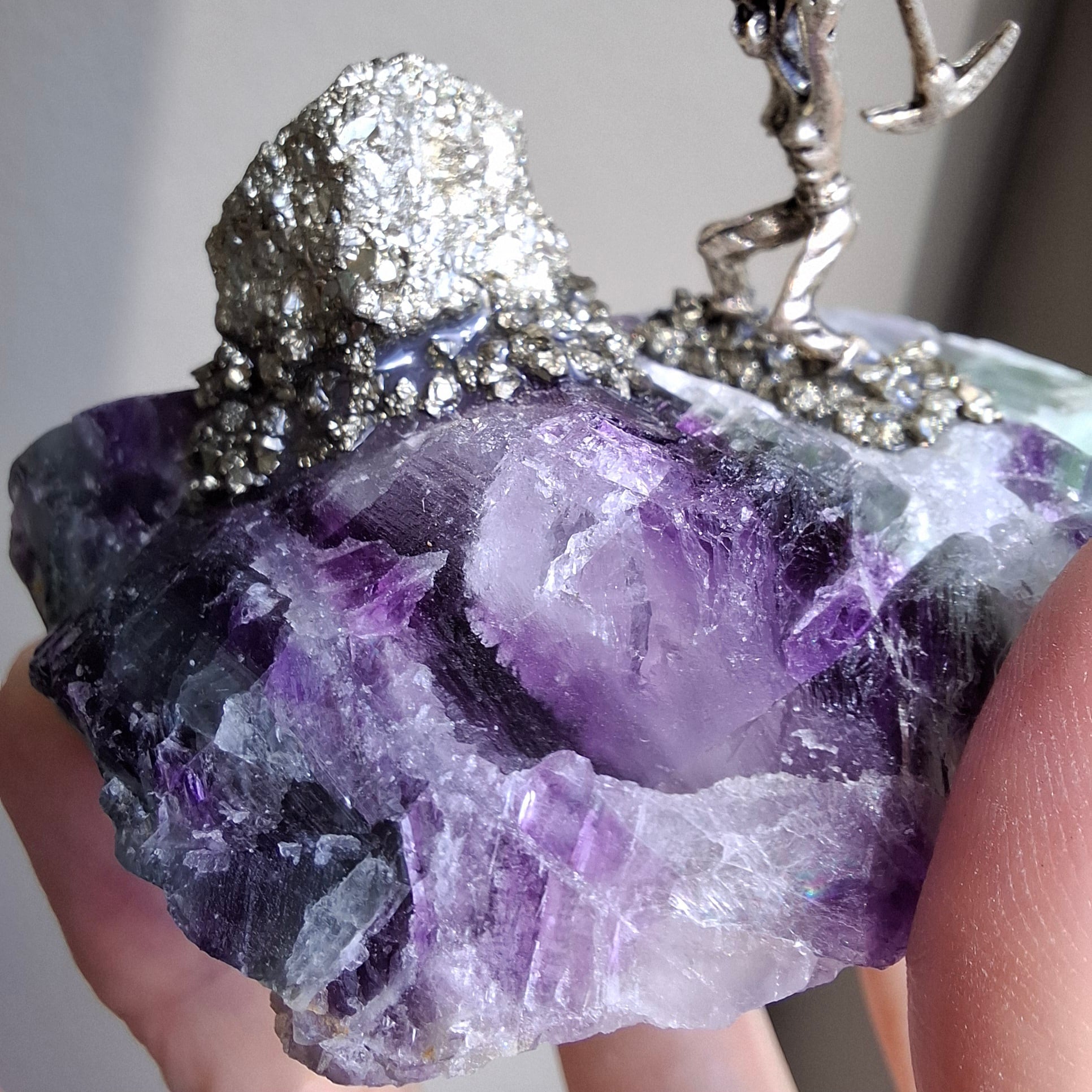 パープル&グリーンのフローライト原石の上に、働く鉱員さんが乗ったユニークなピース♡