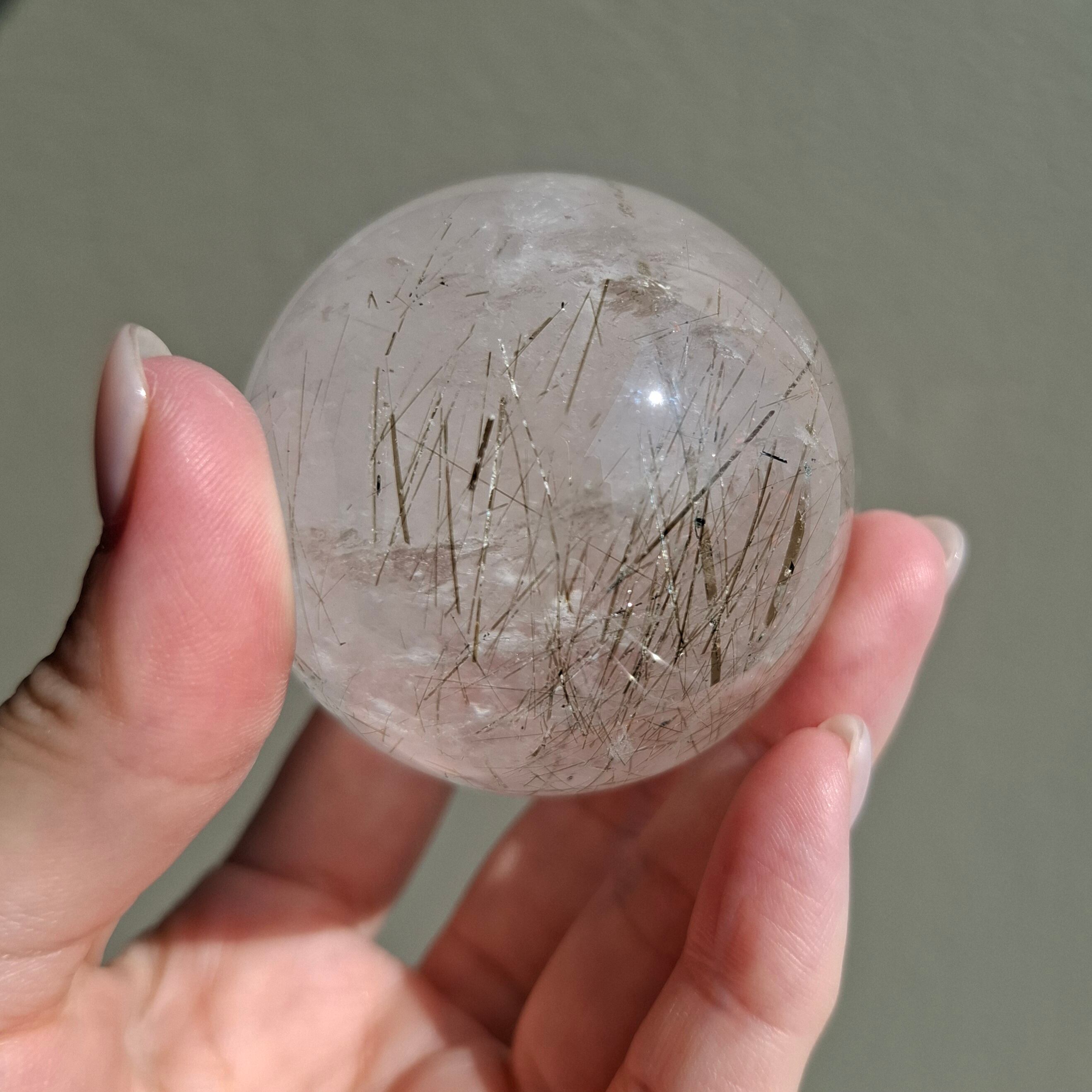 水晶スフィアの中に針状のオリーブグリーンのインクルージョン。